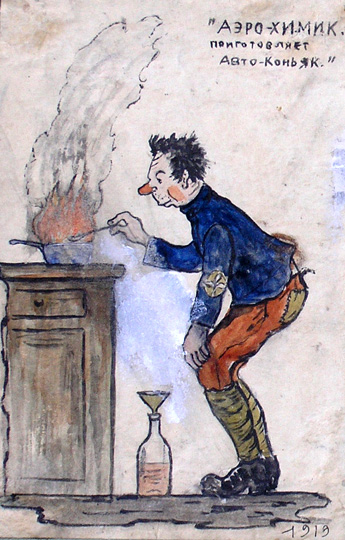 ![]() 1919г. "АЭРО-ХИМИК приготовляет Авто-Коньяк". Любители выпить приготовляли из денатурата немыслимый напиток. 1919. "AERO-CHEMIST prepares Auto-Cognac". Those who liked to drink, prepared unthinkable liquor out of denaturated spirit. |